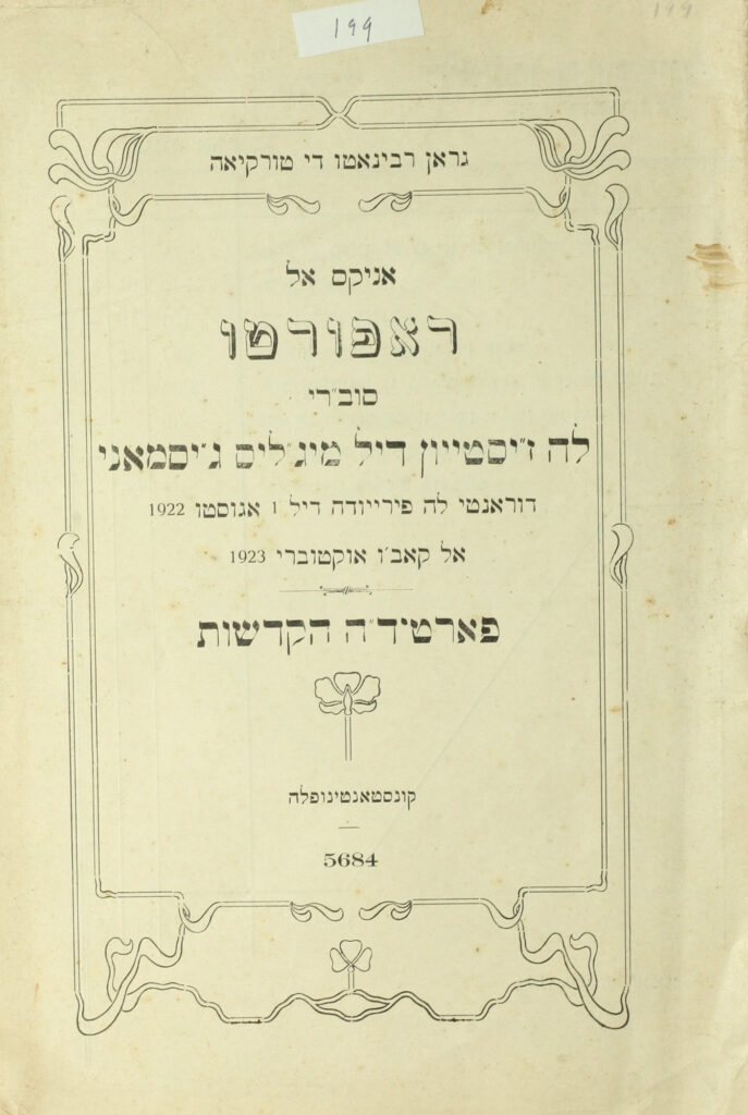 Gran Rabinato Turkiya: Aneks el Raporto: sovre la jestion del medjlis djismani…Agusto 1922 el kavo Oktobre 1923: Partida ha-Kedashot
