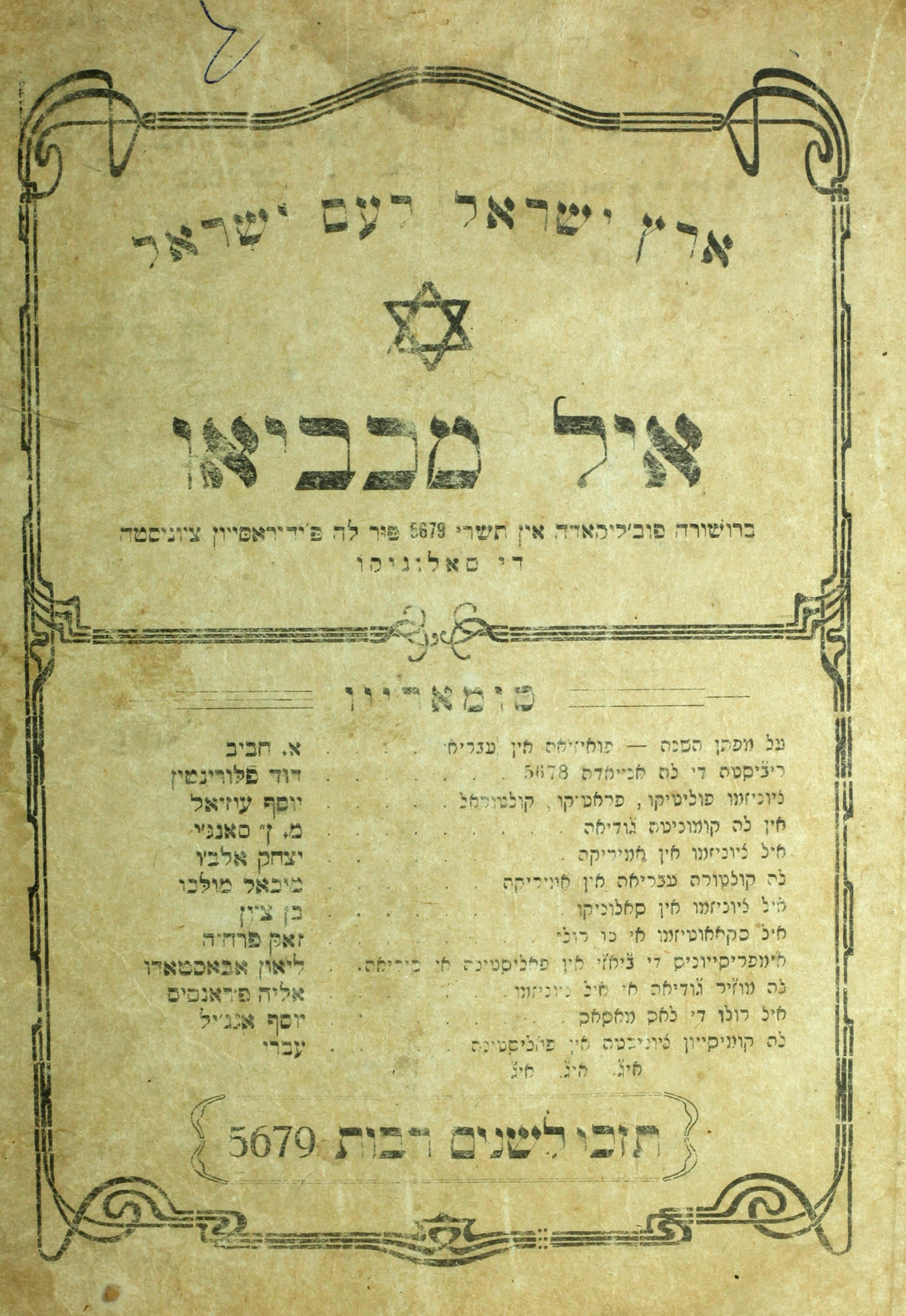 איל מכביאו : ברושורה פוב'ליקאדה אין תשרי 5679 פור לה פ'ידיראסייון ציוניסטה די סאלוניקו