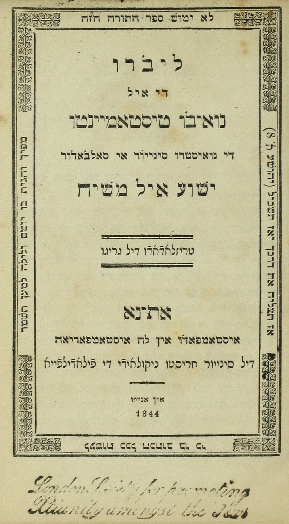 Livro de el nwevo ṭesṭamyenṭo : de nwesṭro senyor i salvadhor Yeshu‘a el Mashiaḥ