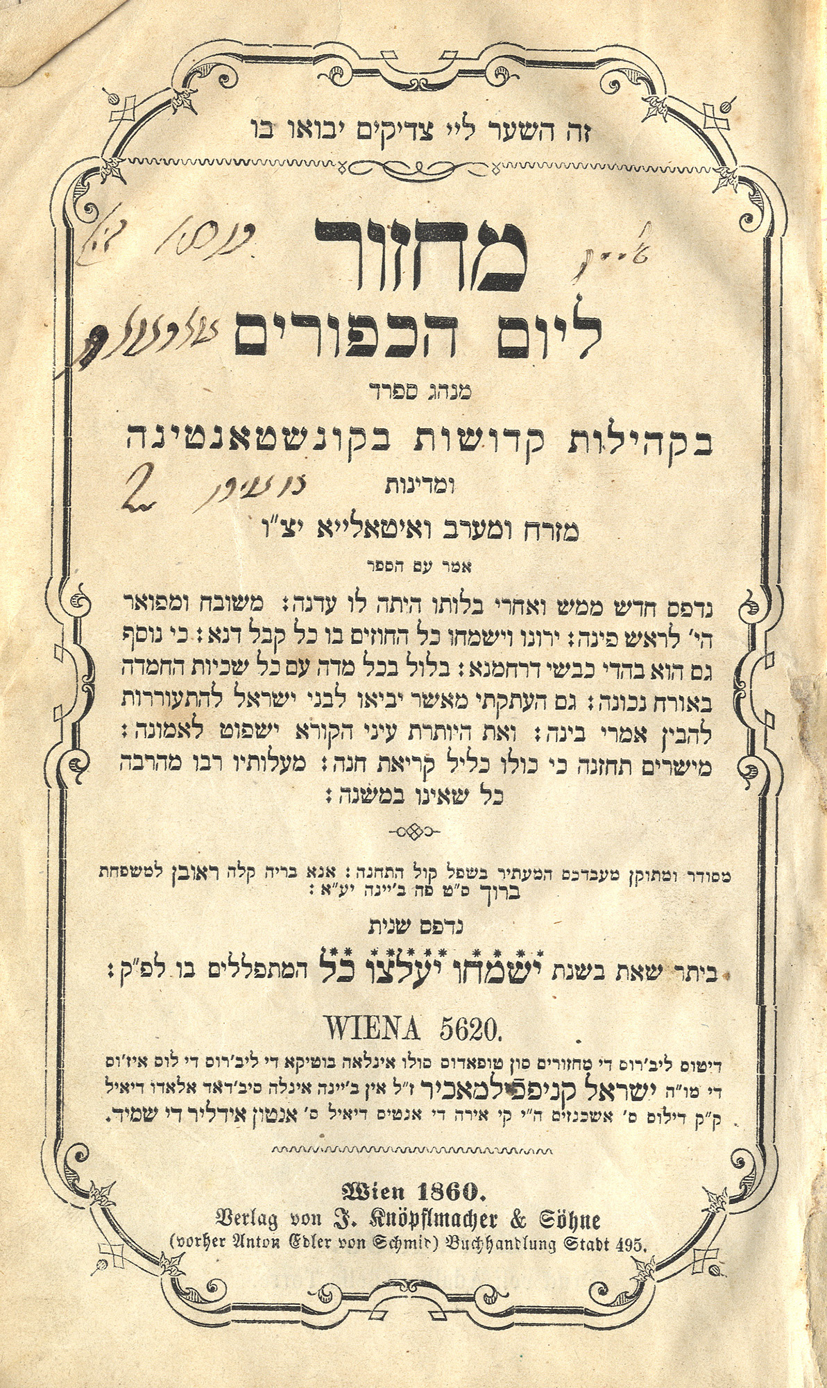 Maḥzor le-Yom ha-Kipurim : minhag sefarad be-ḳehilot ḳedoshot be-Ḳonśṭanṭinah