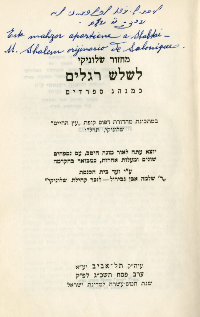 Mahzor Saloniki : le-shalosh regalim ke-minag sefaradim