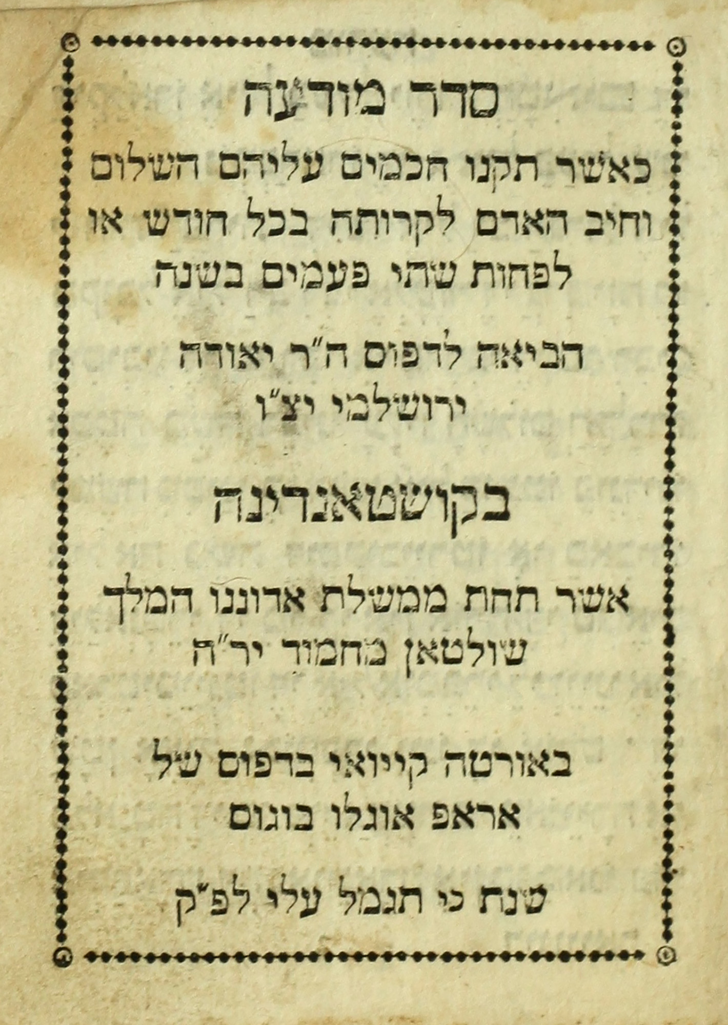 Seder moda‘a : ke-asher tiḳnu ḥakhamim ʻalehem ha-shalom...