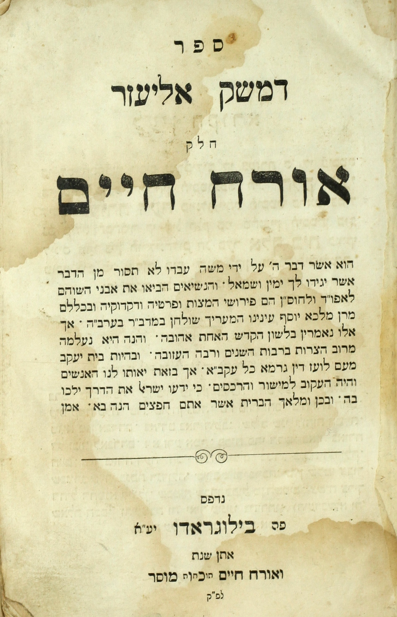 Sefer dameśeḳ Eli‘ezer : ḥeleḳ oraḥ ḥayim
