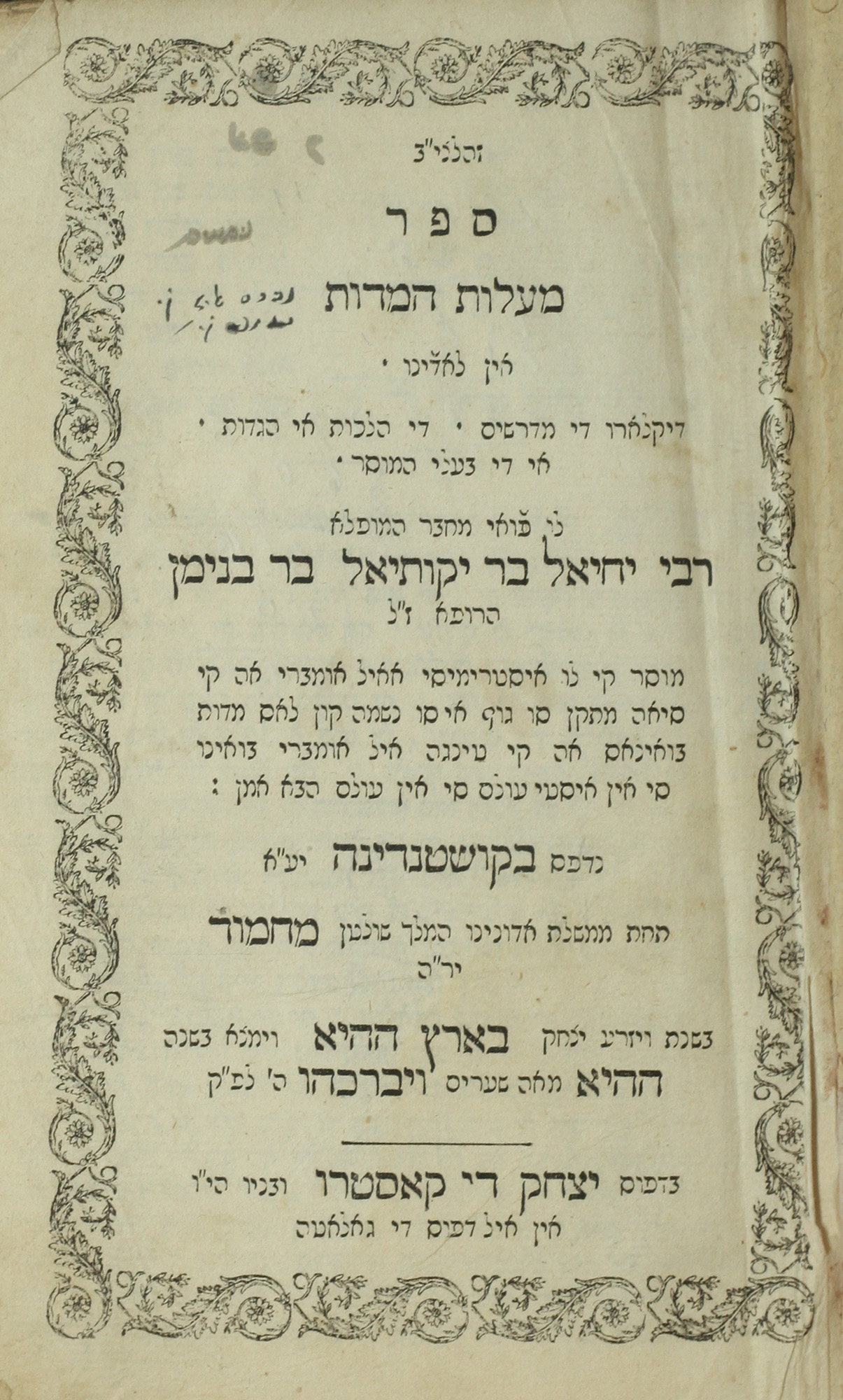 ספר מעלות המדות אין לאדינ'ו : דיקלארו די מדרשים די הלכות אי הגדות אי די בעלי מוסר